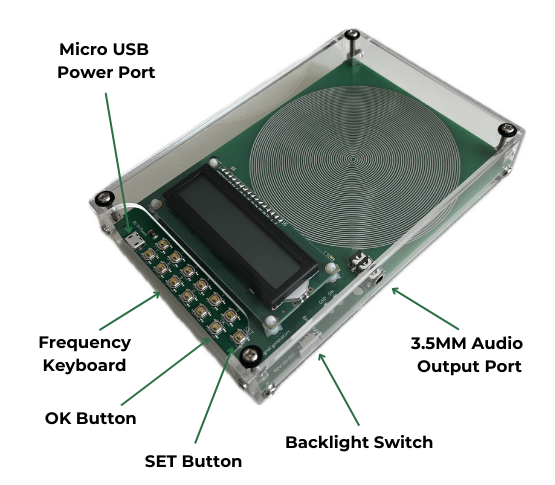 • If you do not use earphones or a speaker, the device will generate a Pulsed Electromagnetic Field (PEMF) of the inputted frequency (no sound), with a radius of approximately 1.5 meters.